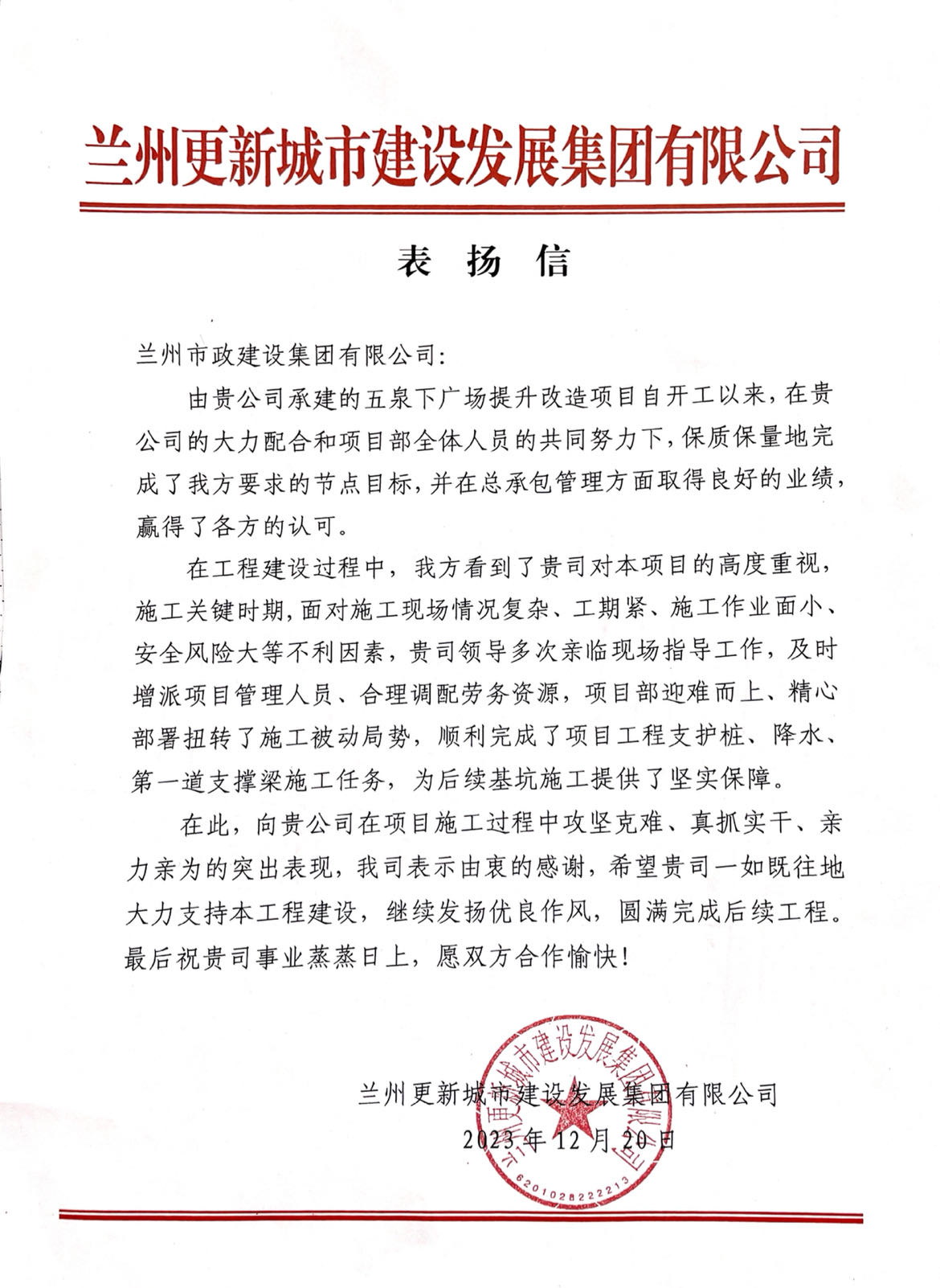 12月20日,蘭州市政建設(shè)集團(tuán)收到業(yè)主單位蘭州更新城市建設(shè)發(fā)展集團(tuán)有限公司的一封表揚(yáng)信。對公司承建的蘭州市五泉下廣場提升改造項(xiàng)目,在公司各級領(lǐng)導(dǎo)的高度重視下,在項(xiàng)目部全體參建員工的共同努力下,面對施工現(xiàn)場情況復(fù)雜、工期緊、施工作業(yè)面小、安全風(fēng)險(xiǎn)大等不利因素,公司領(lǐng)導(dǎo)多次親臨現(xiàn)場指導(dǎo)工作,第四工程公司領(lǐng)導(dǎo)帶班作業(yè),并及時(shí)增派項(xiàng)目管理人員、合理調(diào)配勞務(wù)資源,項(xiàng)目部迎難而上、精心部署,24小時(shí)不間斷作業(yè),扭轉(zhuǎn)了施工被動(dòng)局勢,順利完成了項(xiàng)目工程支護(hù)樁、降水、第一道支撐梁施工任務(wù),保質(zhì)保量地完成了節(jié)點(diǎn)目標(biāo)。在管理方面取得良好業(yè)績,贏得了各方的認(rèn)可,為后續(xù)基坑施工提供了堅(jiān)實(shí)保障。向公司在項(xiàng)目施工過程中攻堅(jiān)克難、真抓實(shí)干、親力親為的突出表現(xiàn)表示由衷的感謝。