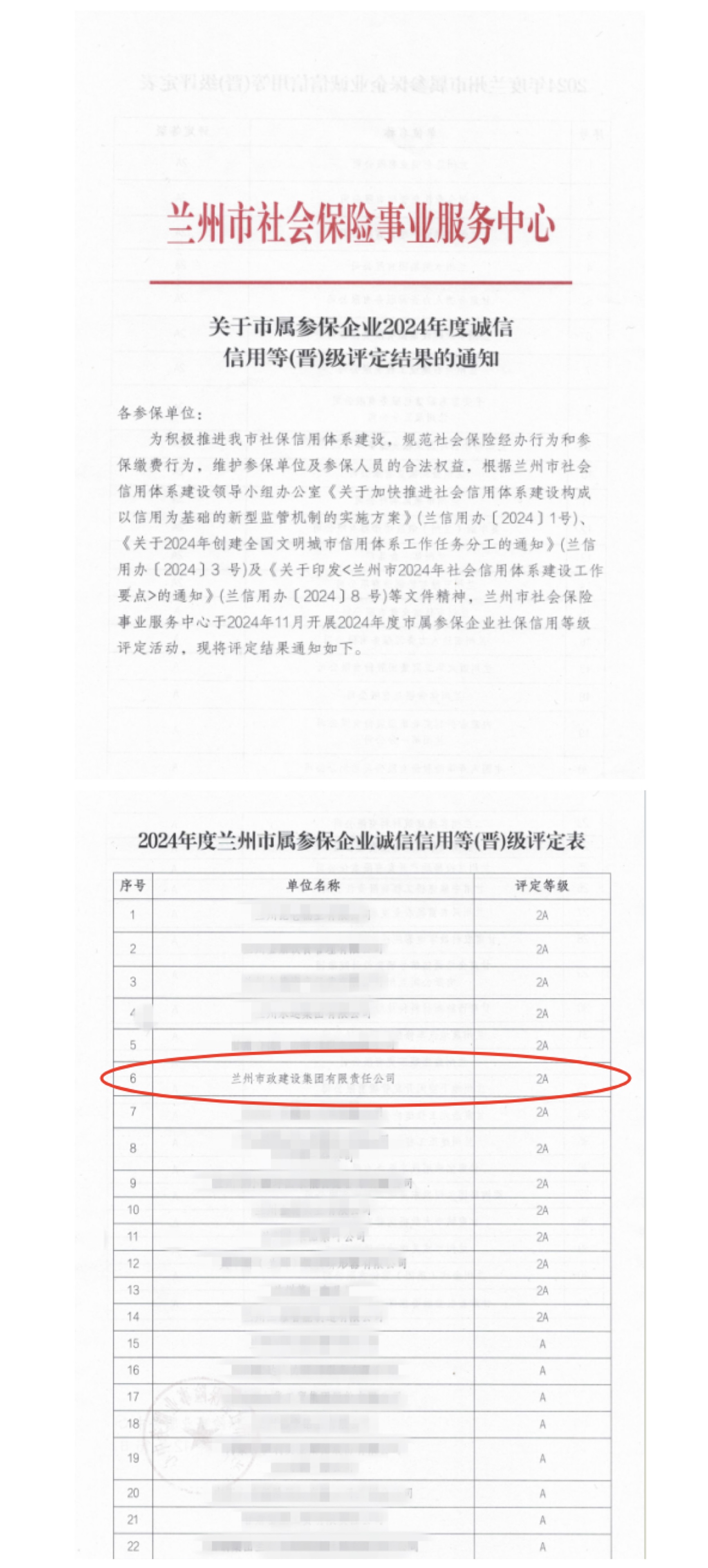 近日,蘭州市社保中心公布了市屬參保企業(yè)2024年度誠(chéng)信信用等級(jí)評(píng)定結(jié)果,蘭州市政建設(shè)集團(tuán)成功獲評(píng)2A等級(jí),為市級(jí)社保信用評(píng)定的最高等級(jí)。