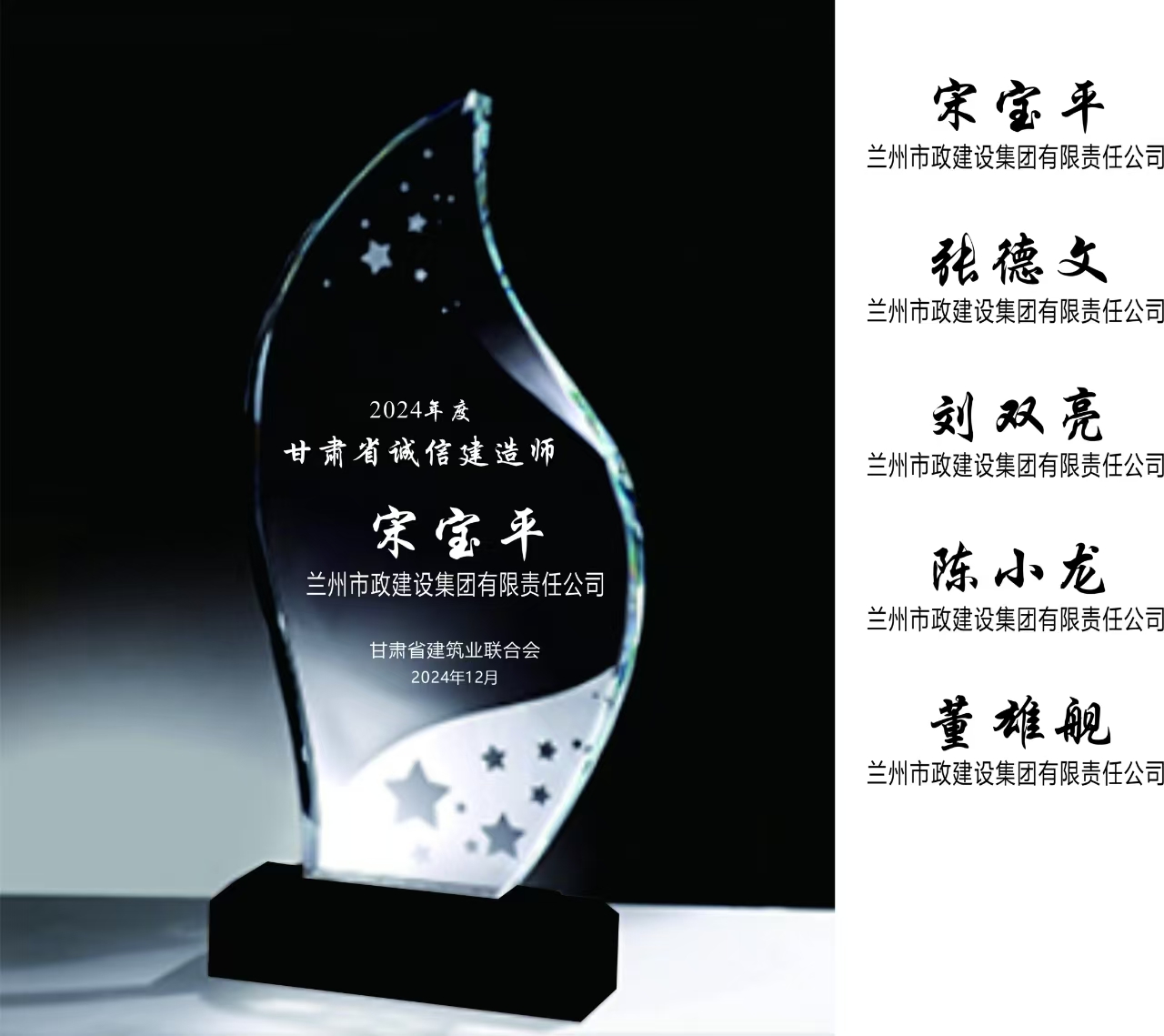 宋寶平、張德文、劉雙亮、陳小龍、董雄艦5名同志獲得“甘肅省誠(chéng)信建造師”榮譽(yù)稱號(hào)。
